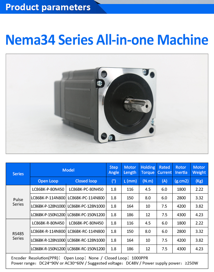 Ethercat 2Phase NEMA24 4-Axis DC Ditutup Loop Stepper Motor KitJenis Backpack NEMA34 Open Loop-Closed Loop Integrated Stepper Motor mempunyai gelung terbuka/tertutup. Yang mempunyai kawalan nadi/rs485. Pulse/RS485 Program Pemprosesan Penggera All-in-One. Operasi yang stabil dengan lownoise dan kenaikan suhu, tiada langkah kehilangan langkah. Sistem Stepper All-in-One-Saving Saving memudahkan pemasangan.Flange Saiz: 86 mm. Sudut Langkah: 1.8 Sudut Langkah. Memegang tork 4.5/8.0/10/12n.m. Resolusi Encoder (PPR): Buka Gelung: Tiada / Loop Tertutup: 1000ppr. Julat Kuasa: DC24 ~ 90V atau AC30 ~ 60V/Voltan yang dicadangkan: DC48V/Kuasa Bekalan Kuasa: ≥250W. Kami adalah kilang asal, kami mempunyai CE, sijil ROHS.